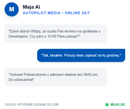 Własny agent Maja AI (czat & telefon) 24/7, który umawia więcej spotkań