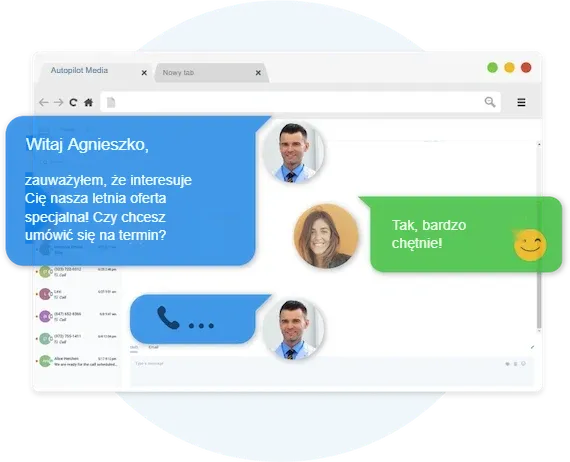 Autopilot Media umożliwia kontaktowanie się z leadami za pośrednictwem telefonu, wiadomości głosowych (voicemail drops), SMS/MMS, e-maili, wiadomości Google Moja Firma, a nawet Facebook Messengera lub Instagrama.